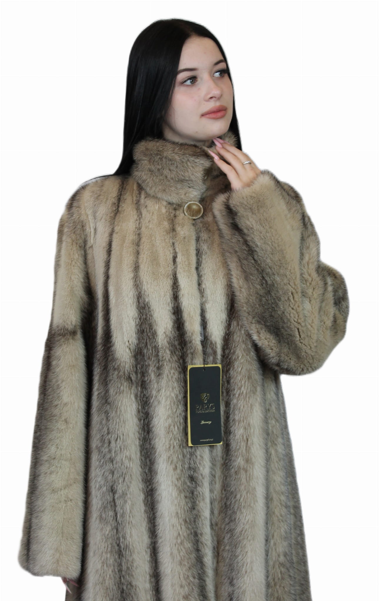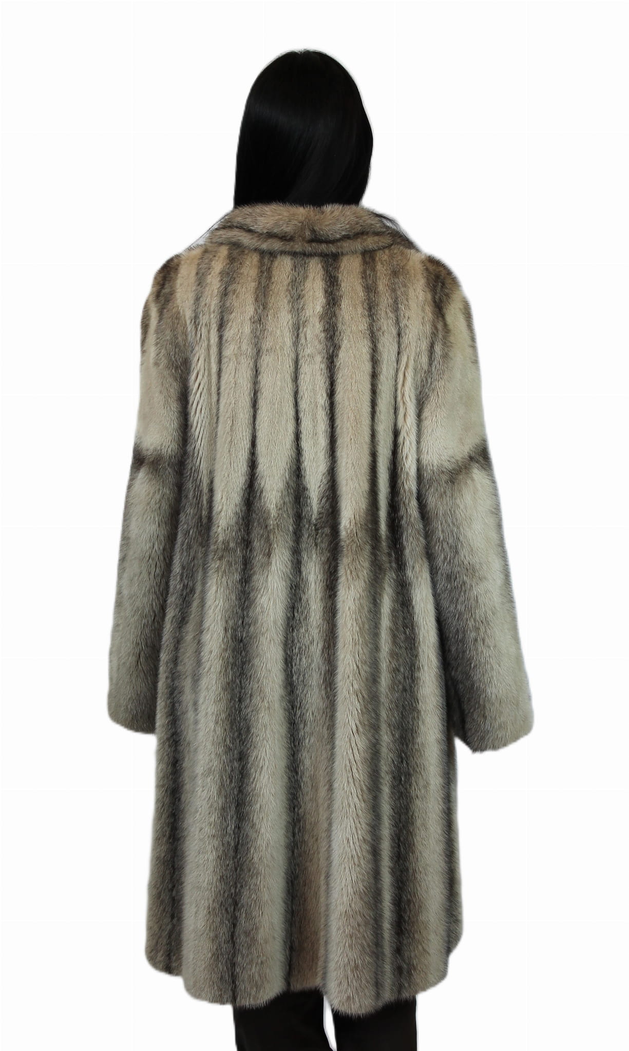 Wyjątkowy kolor i subtelny połysk futra nadają mu luksusowy charakter, a długość 105 cm sprawia, że doskonale otula sylwetkę i prezentuje się niezwykle szykownie.