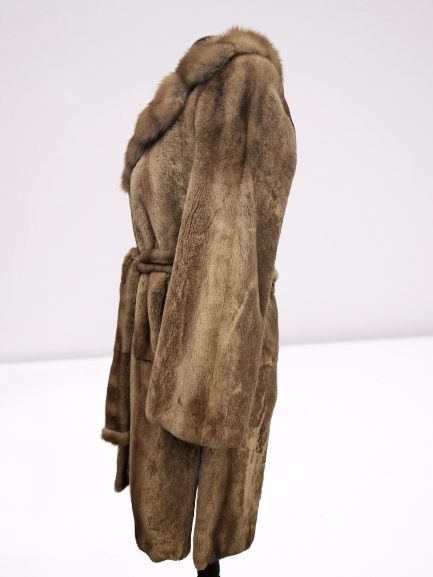 Klasyczny płaszcz wykonany z najwyższej jakości naturalnego futra norek, utrzymany w ciepłych, szlachetnych odcieniach pastelowego brązu.