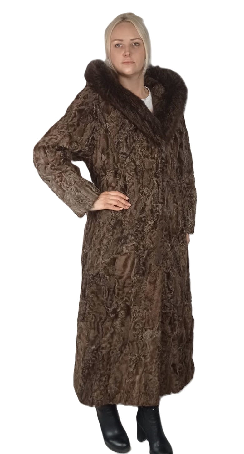 Kurtka wykonana z naturalnego futra karakułów, z kołnierzem z futra lisa.