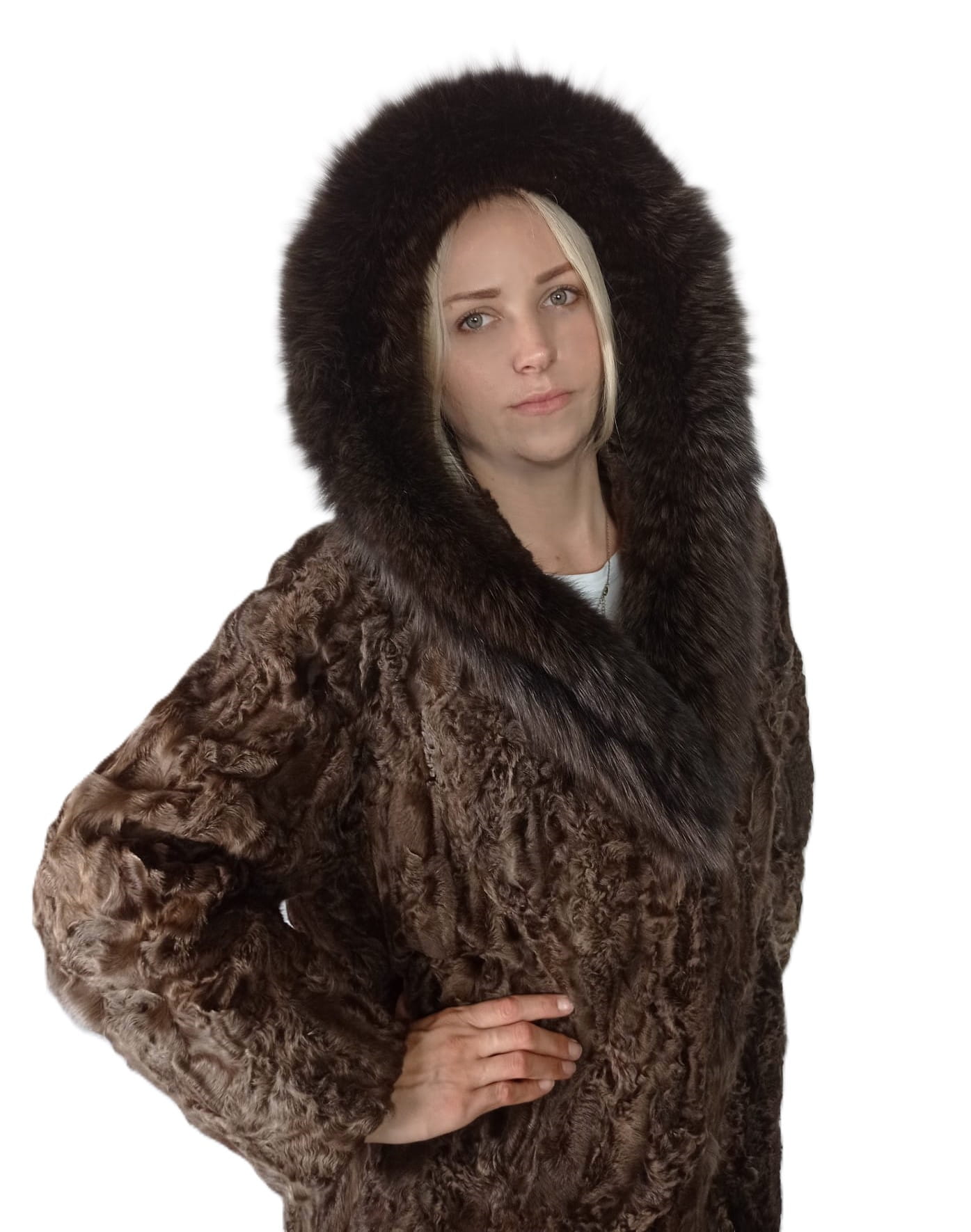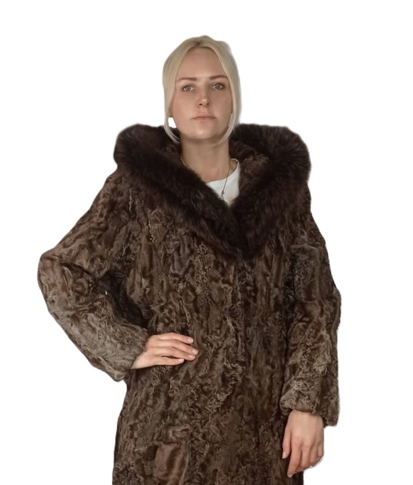 Płaszcz naturalne futro z karakuł Model KAJA z kapturem