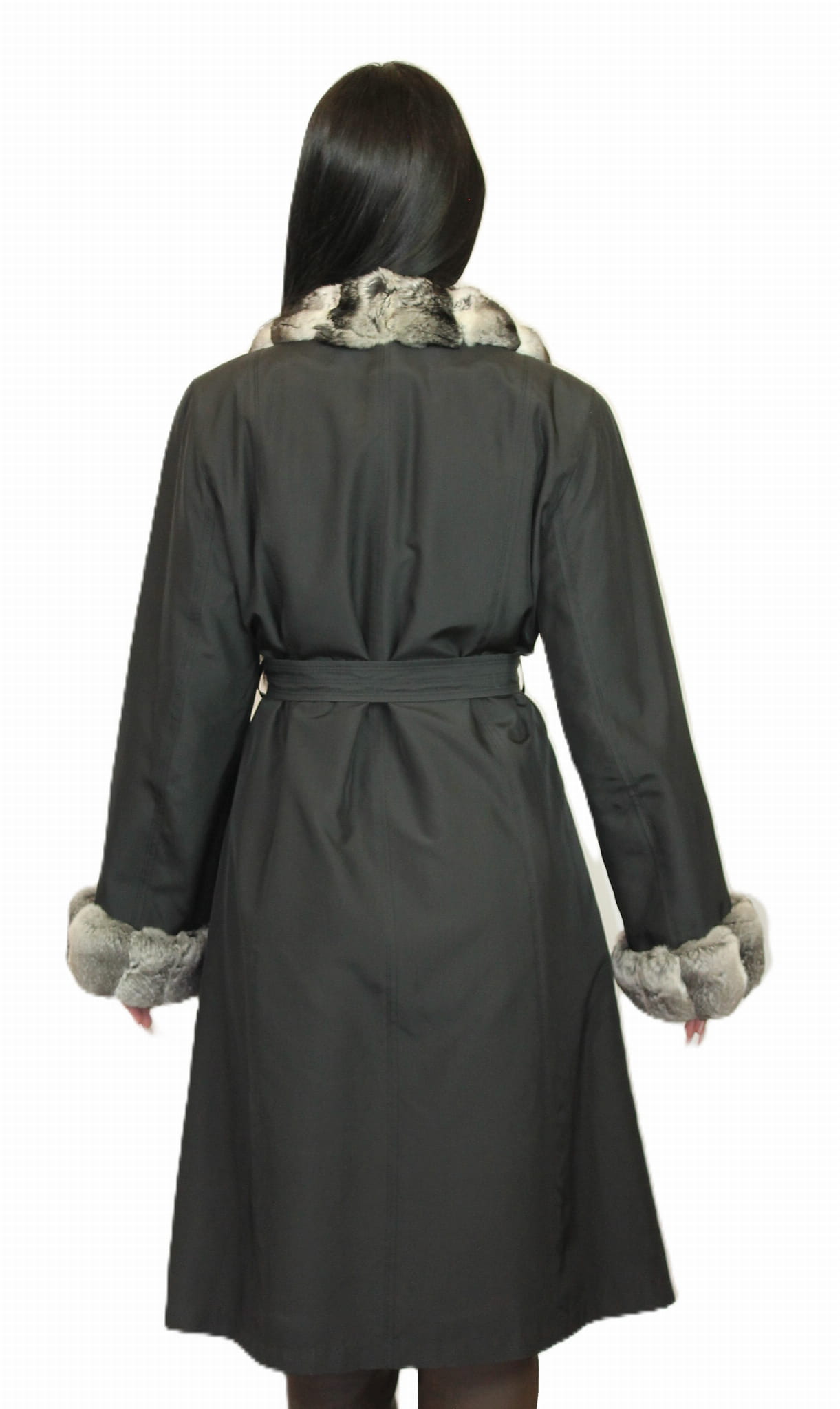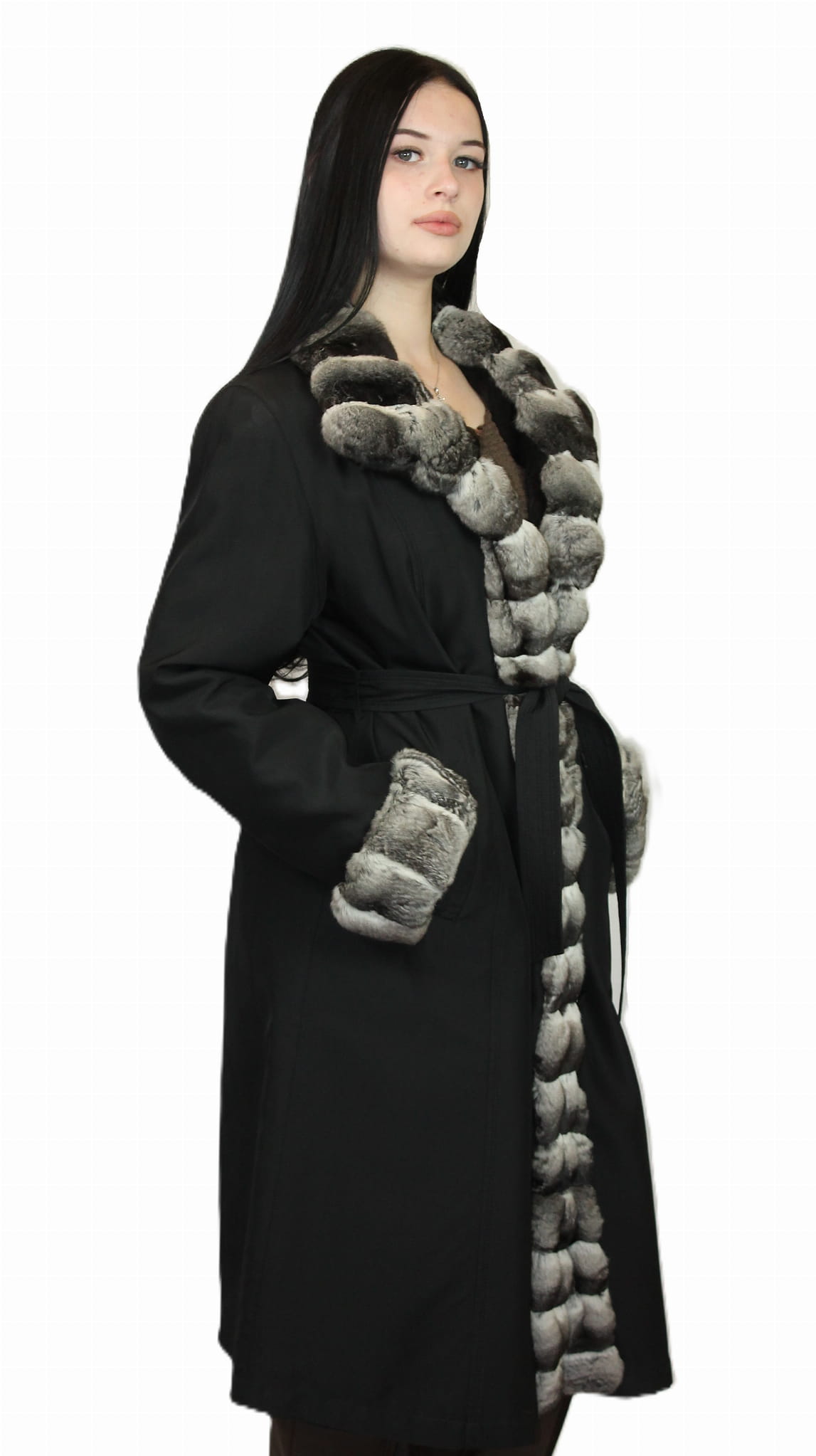 Kołnierz, mankiety i obszycie na całej długości zdobi efektowne futro z szynszyli, nadające całości wyjątkowego charakteru.