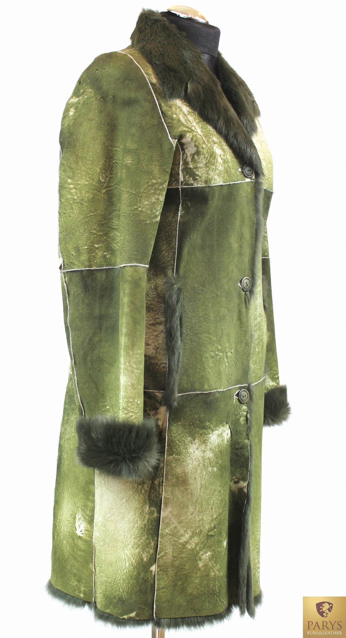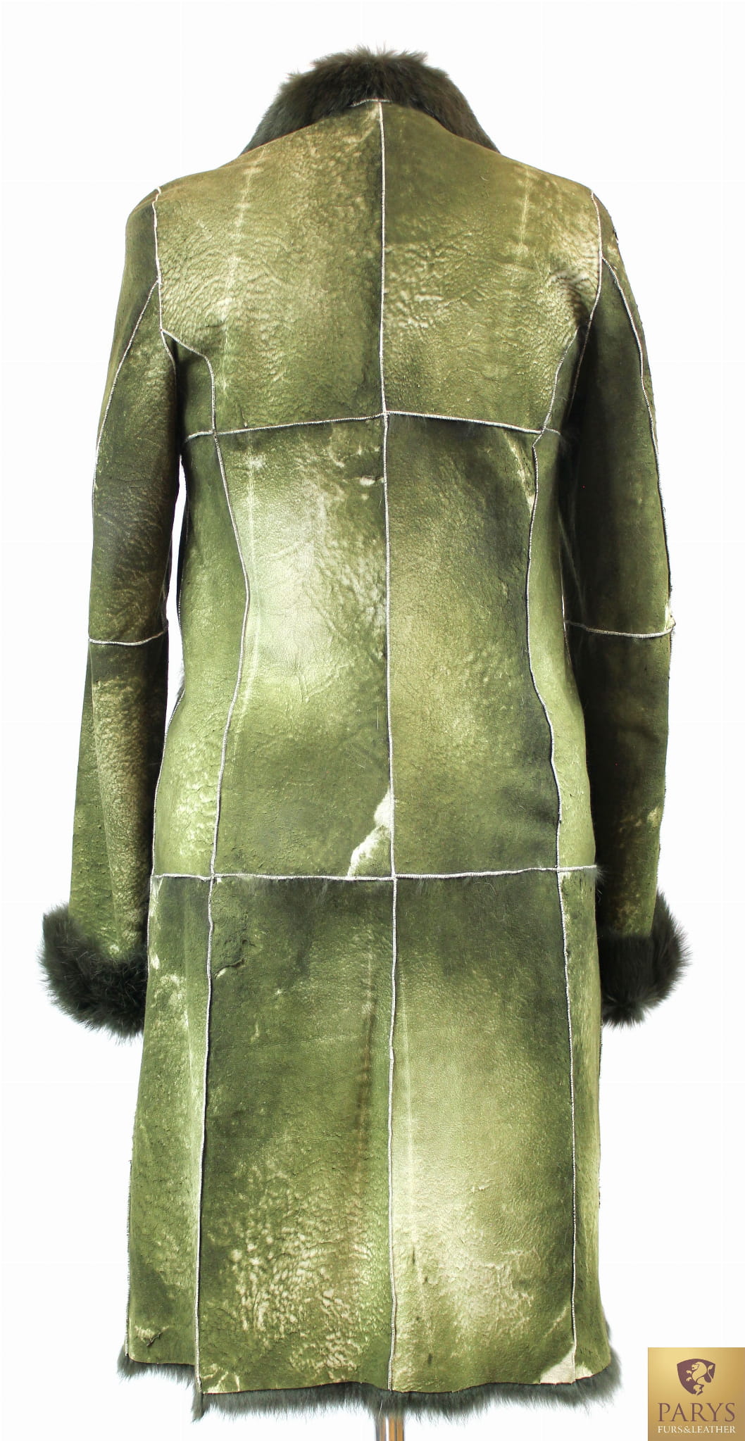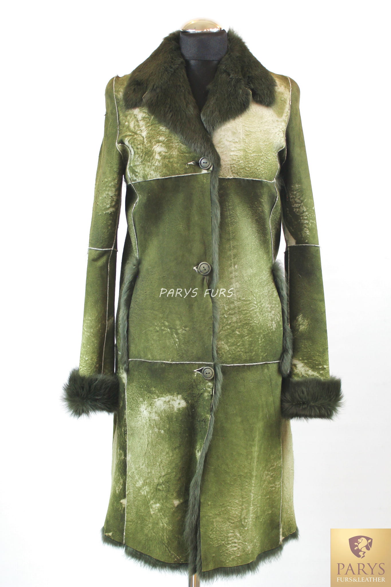 Bardzo lekki, długi płaszczyk damski, uszyty z naturalnej skóry o wyglądzie jeansu. Wnętrze w całości obszyte miękkim, naturalnym futerkiem z królika w kolorze ciemnej zieleni, które zapewnia komfort i subtelne ocieplenie.