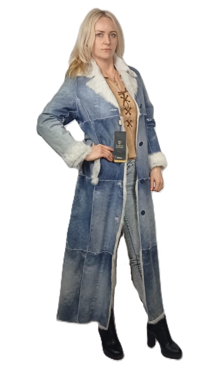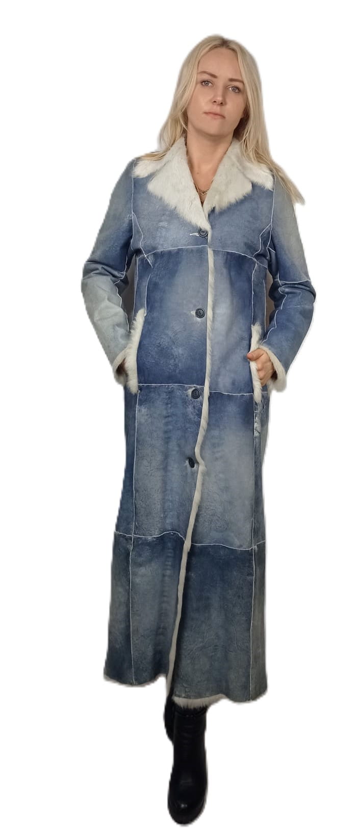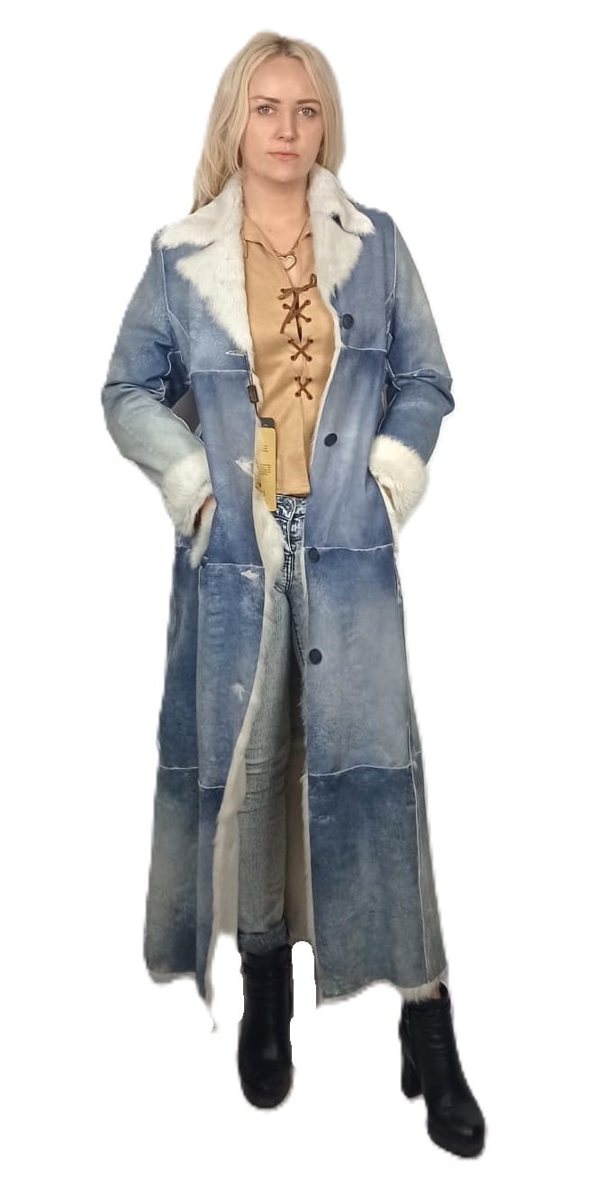 Płaszczyk uszyty z naturalnej skóry o wykończeniu przypominającym jeans. Wnętrze w całości obszyte jest miękkim, naturalnym futerkiem z królika w kolorze białym, które zapewnia komfort i ciepło.
