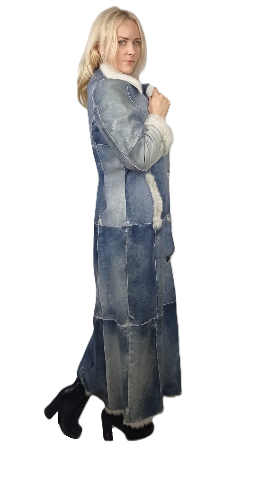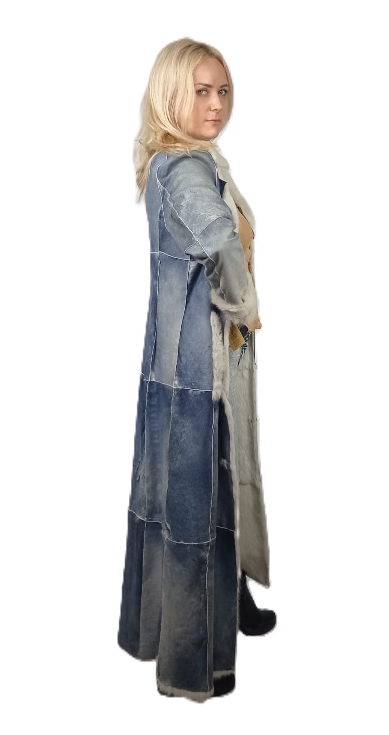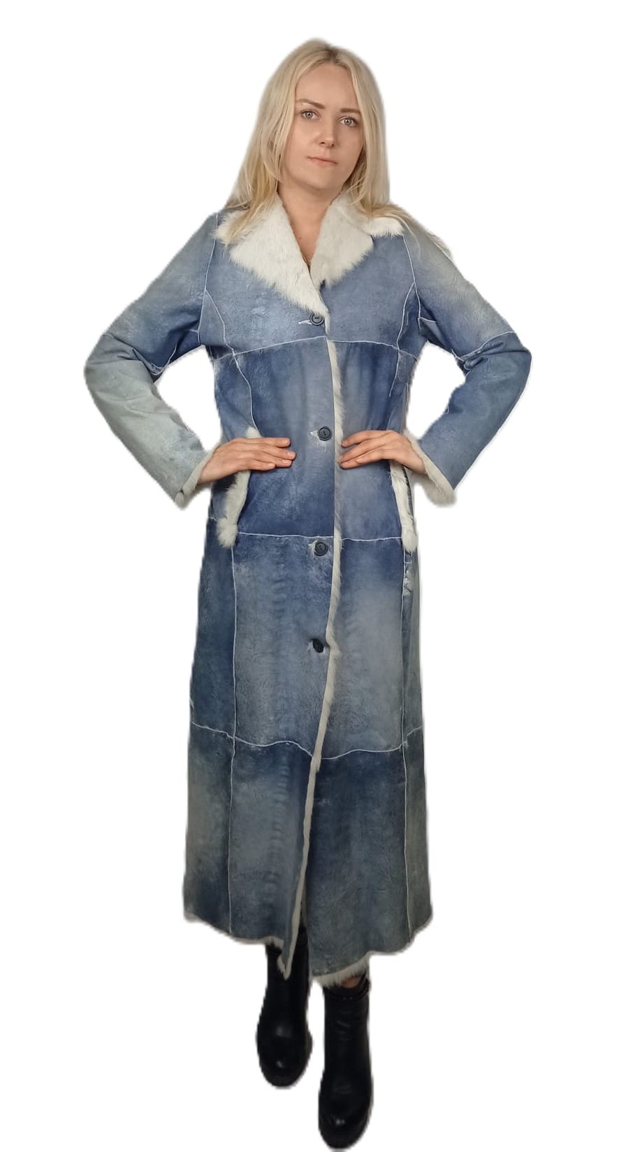 Płaszczyk uszyty z naturalnej skóry o wykończeniu przypominającym jeans. Wnętrze w całości obszyte jest miękkim, naturalnym futerkiem z królika w kolorze białym, które zapewnia komfort i ciepło.