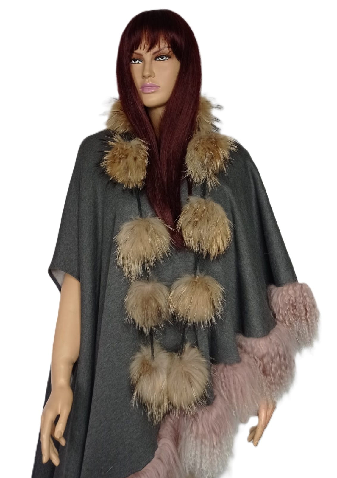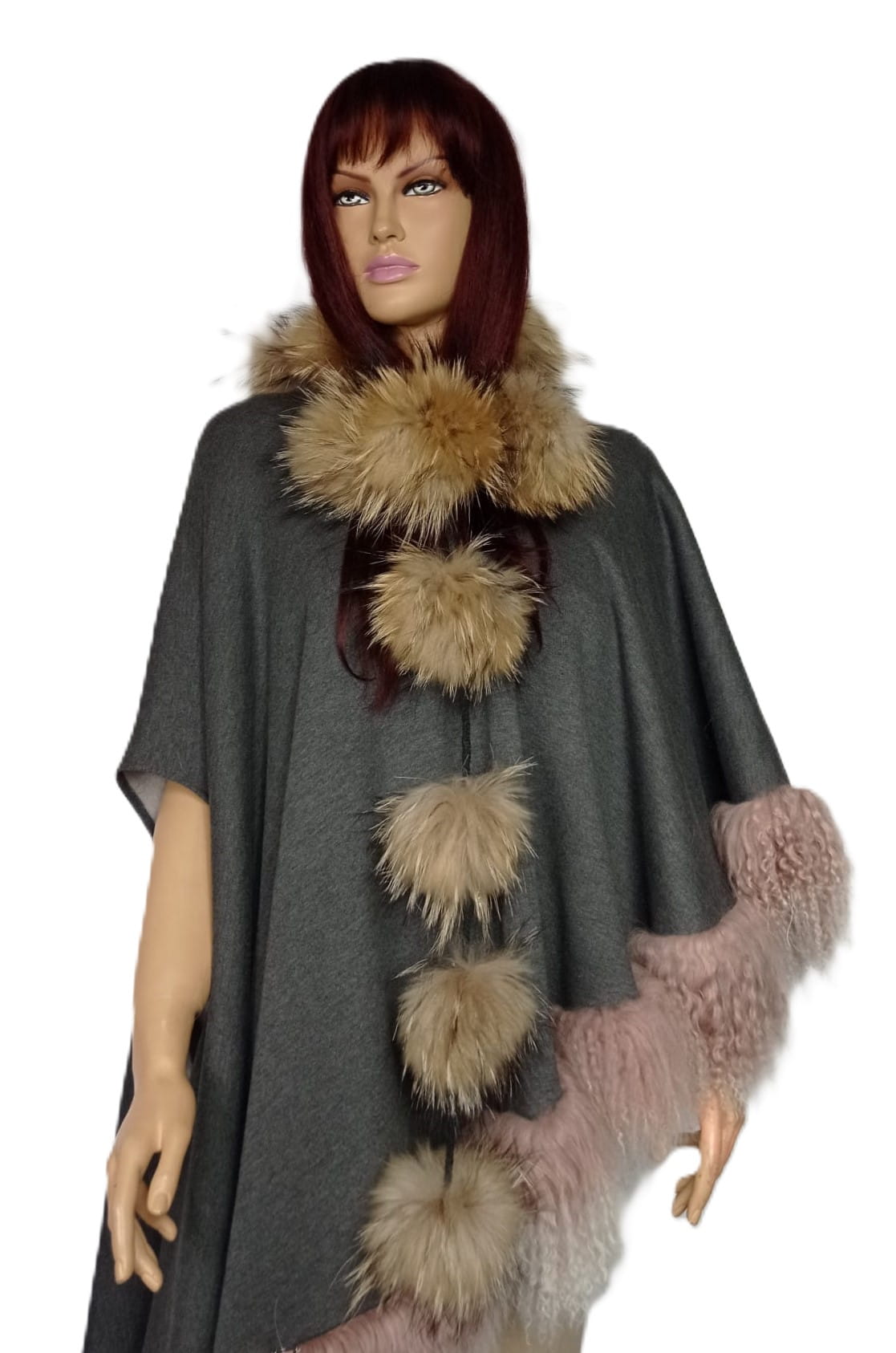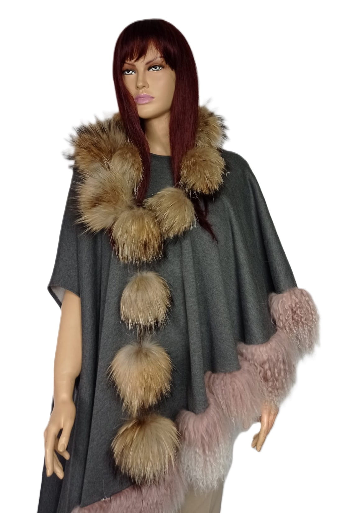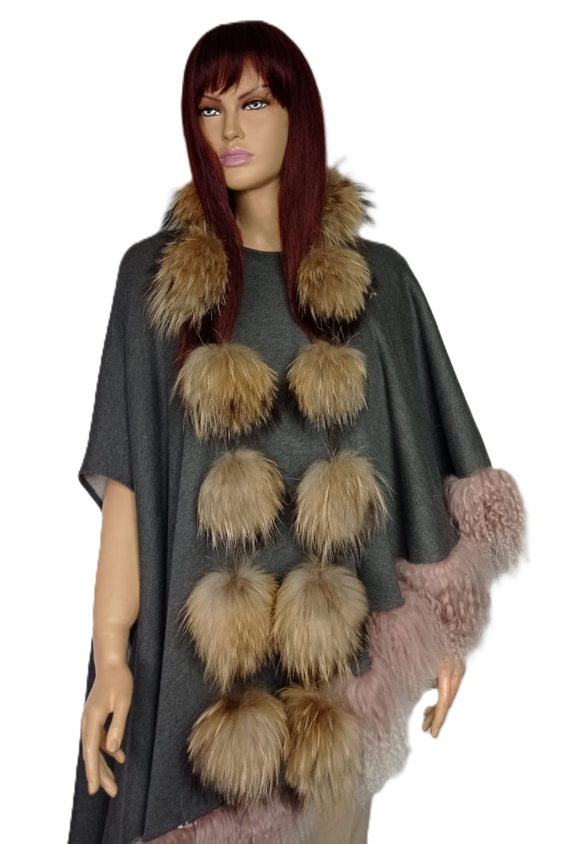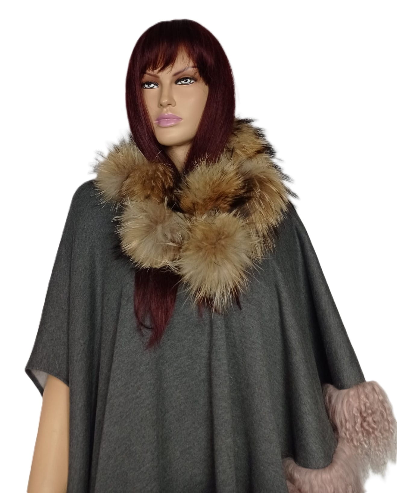 Niebanalny szal wykonany z delikatnych kulek z naturalnego futra jenota, połączonych plecionym, subtelnym sznureczkiem.