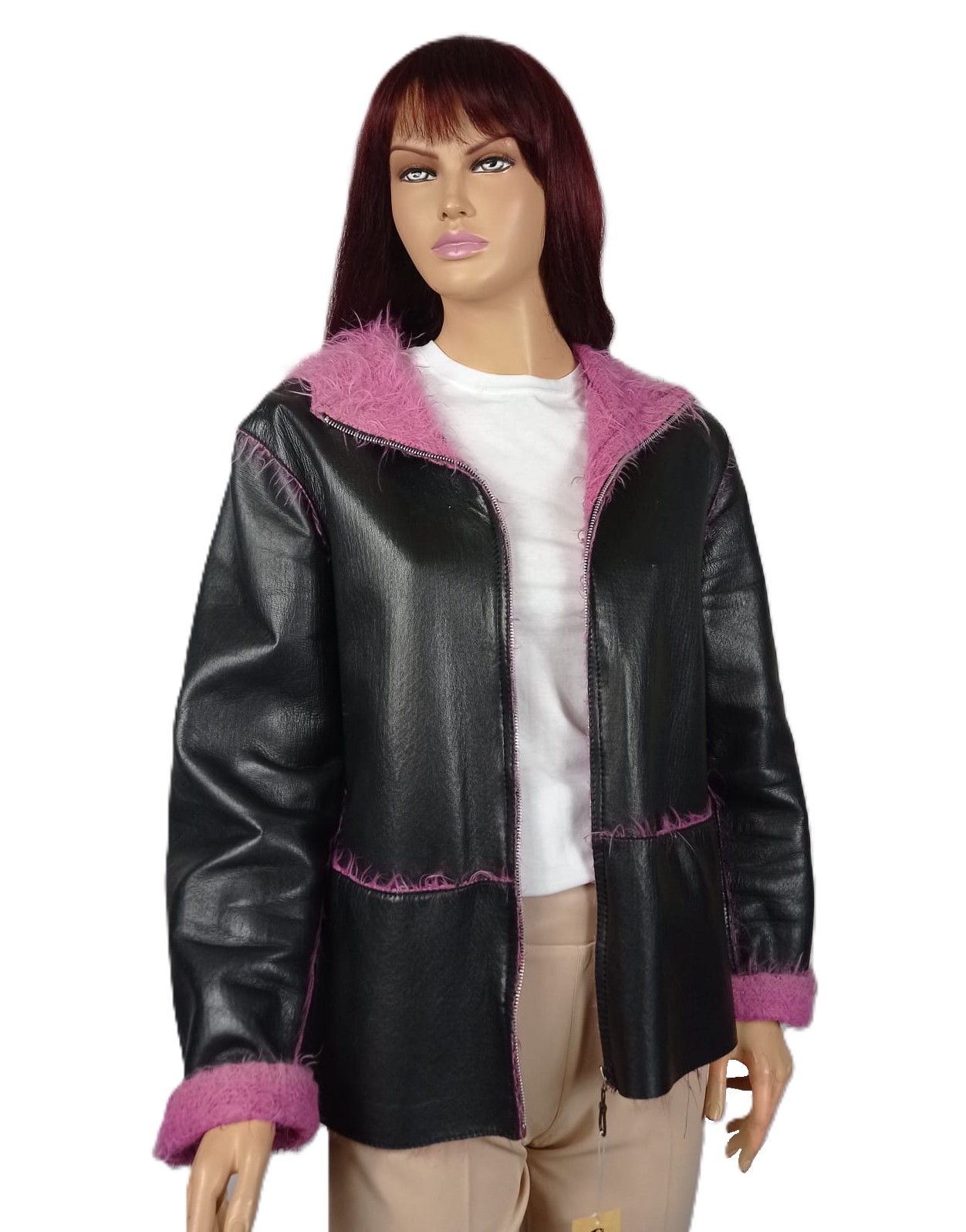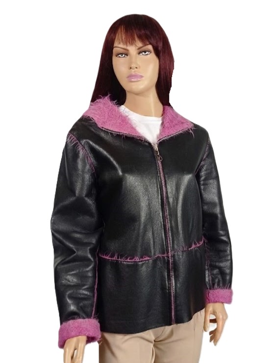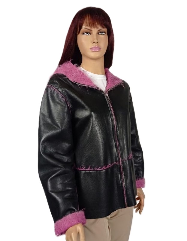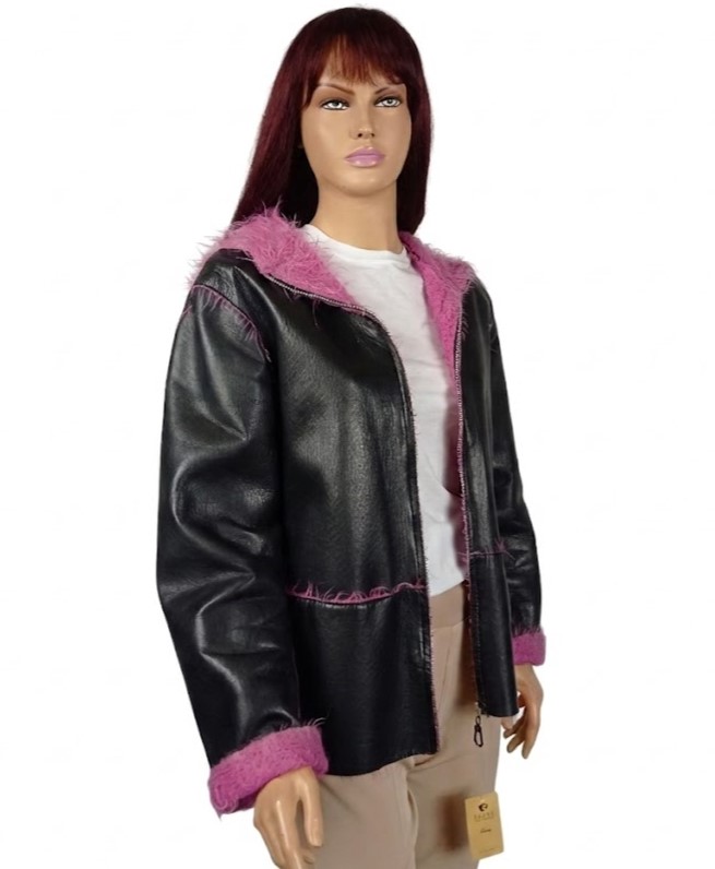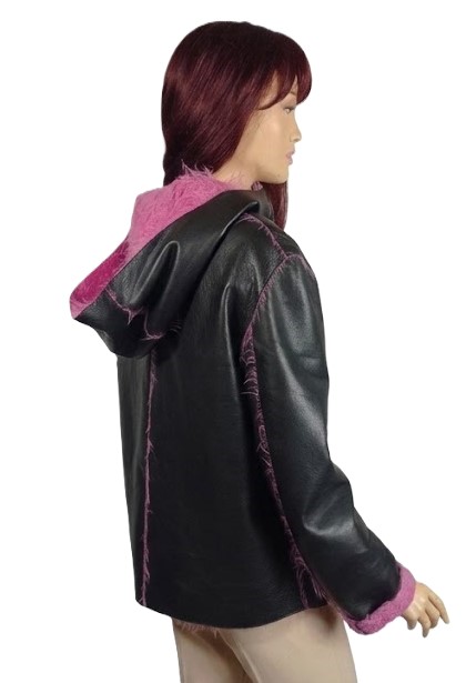 Skórzana kurtka damska z kapturem i różową efektowną podszewką