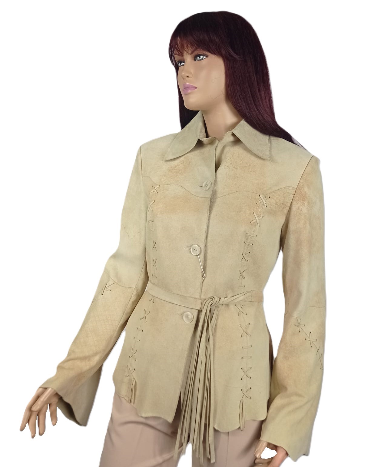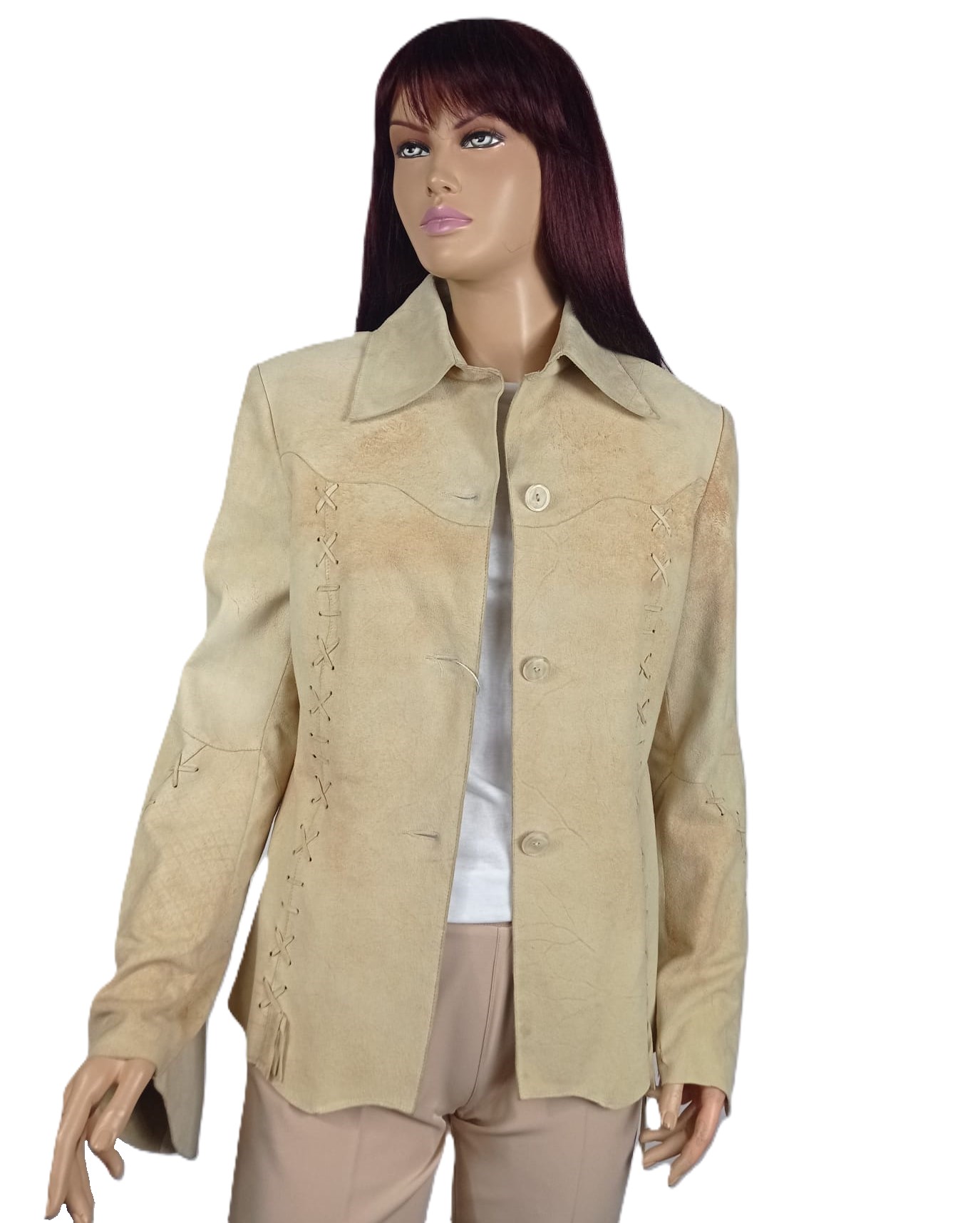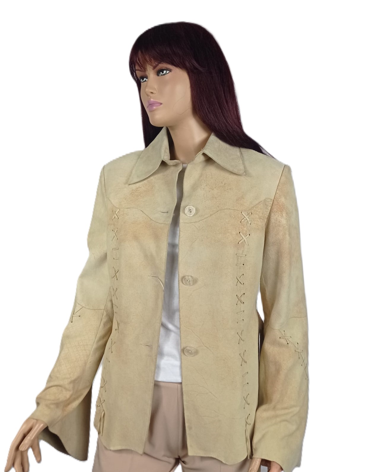 Kurtka utrzymana jest w odcieniu beżu z delikatnymi karmelowymi przetarciami, które podkreślają jej szlachetny, naturalny charakter.