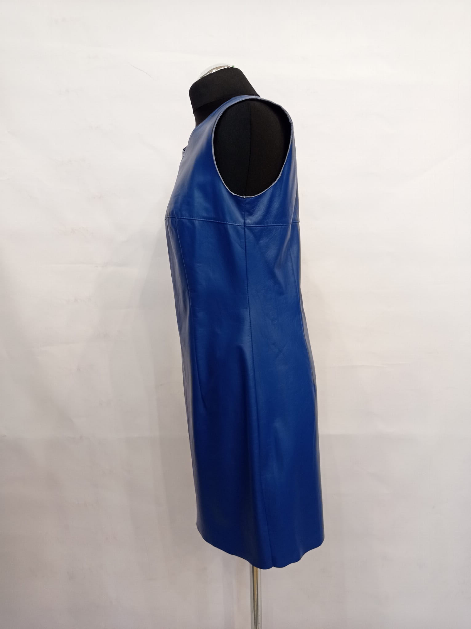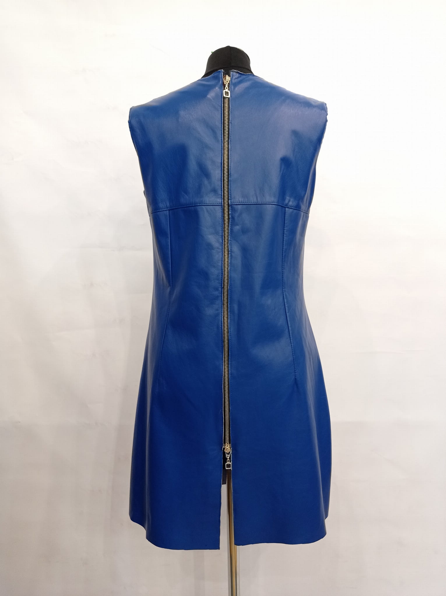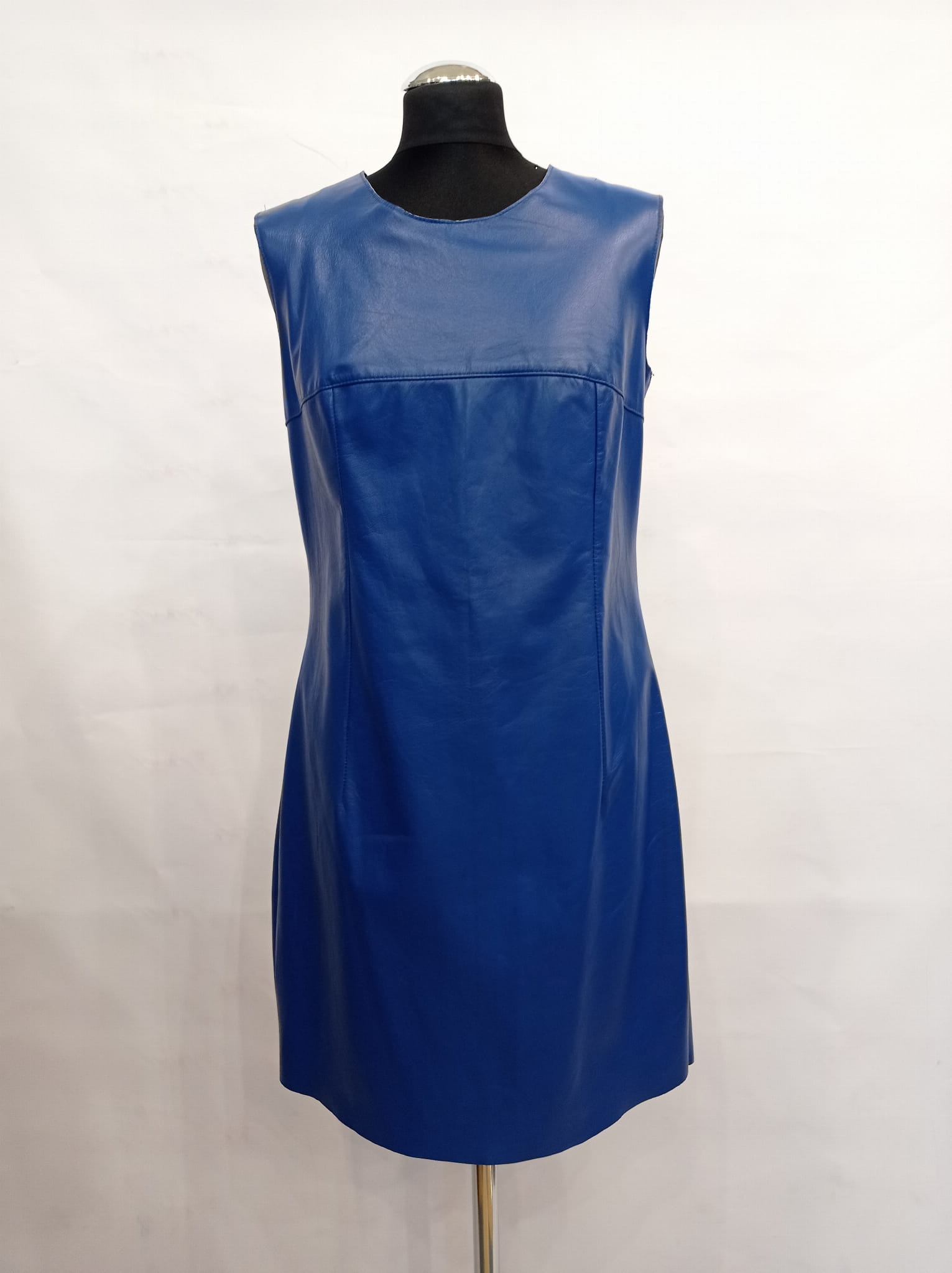 Ekstrawagancka sukienka skórzana w kolorze kobaltowym. Sukienka posiada z tyłu długi suwak, co jest widoczne na zdjęciu. Rozmiar: 38