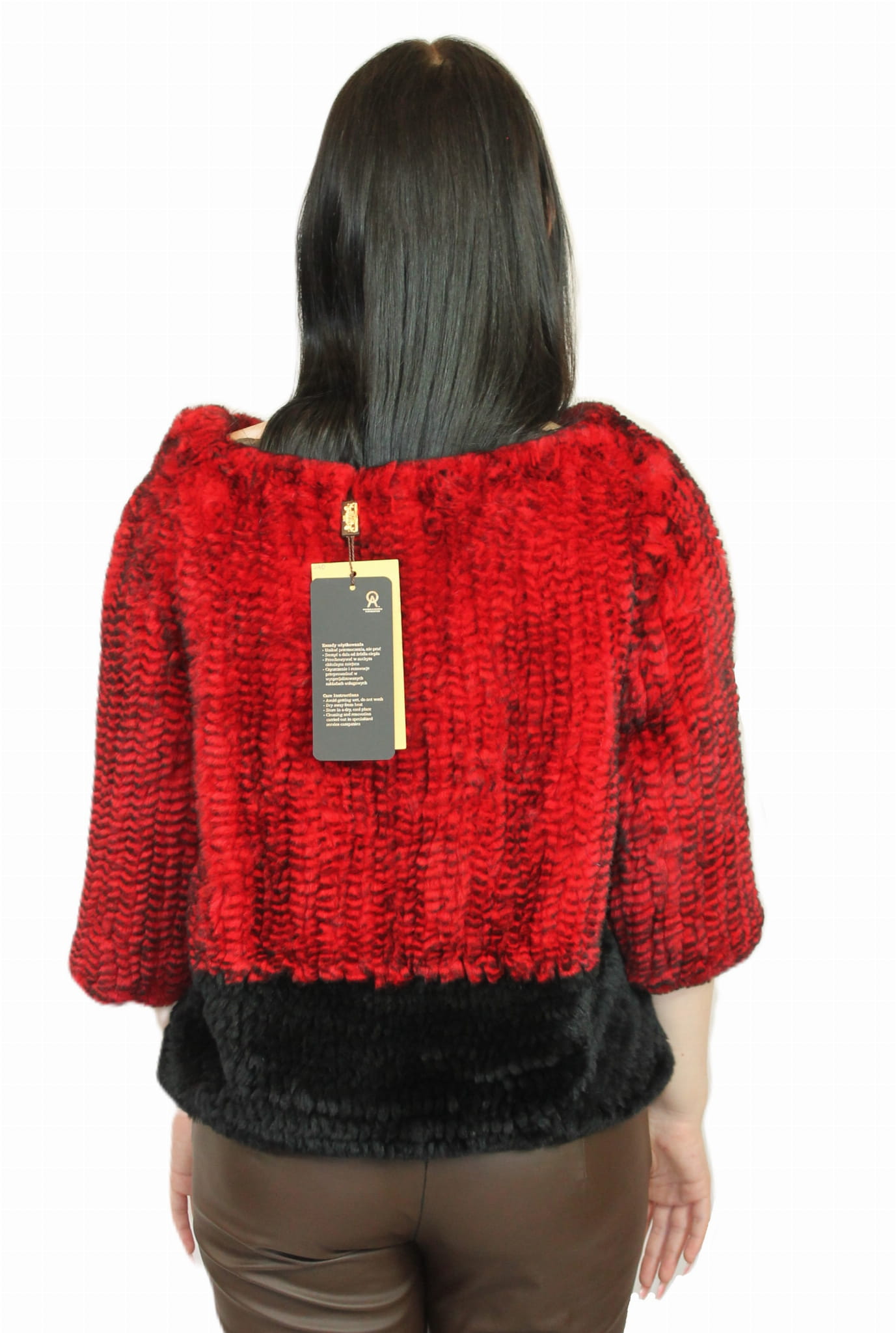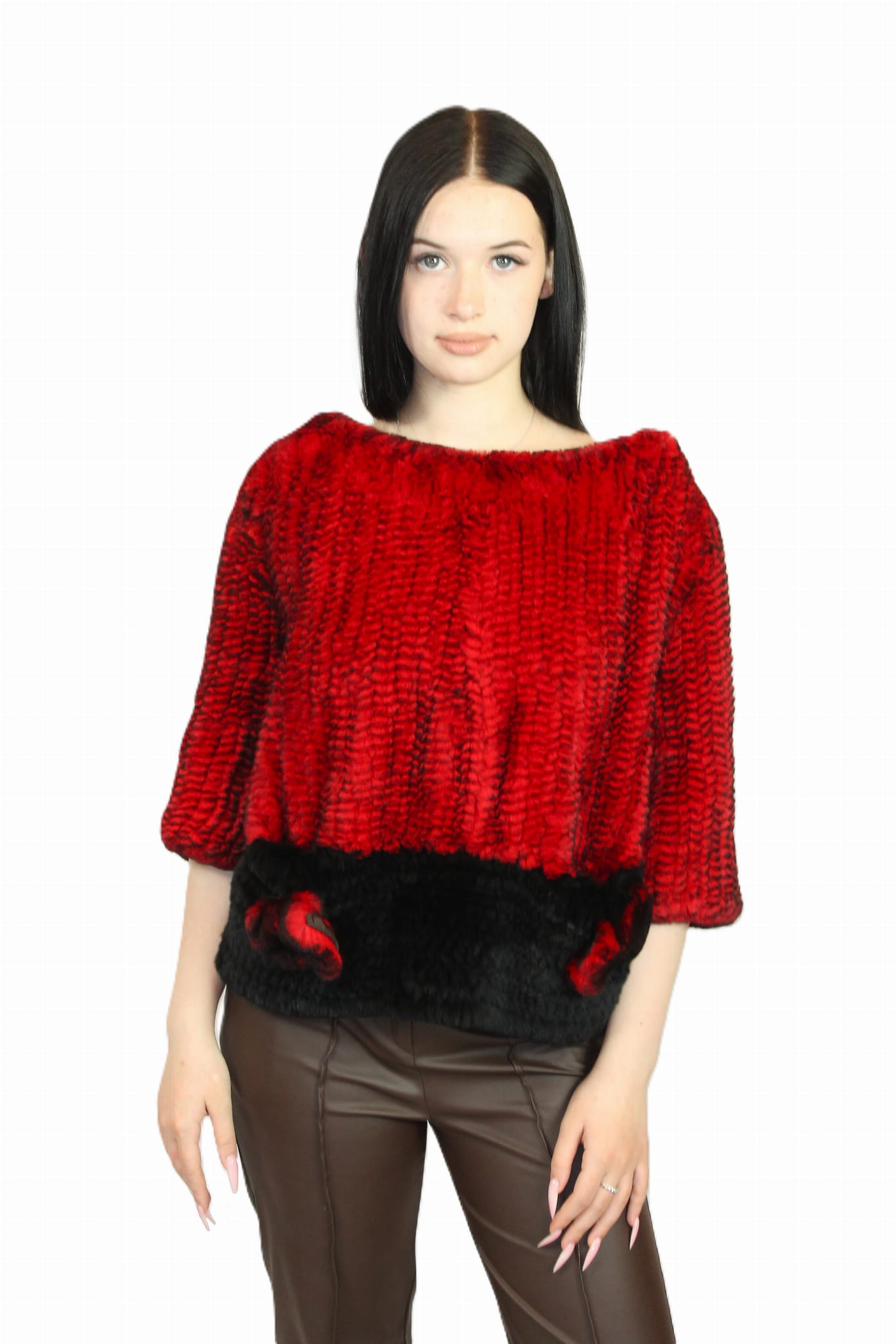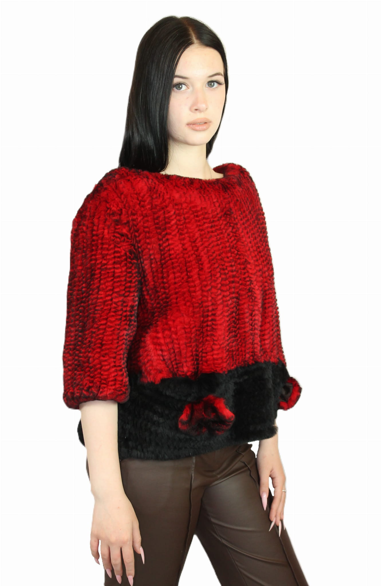 Elegancki sweterek z futra Rex – czerwono-czarny, z kieszeniami