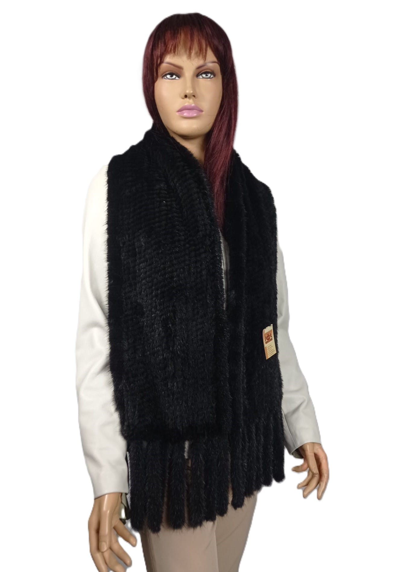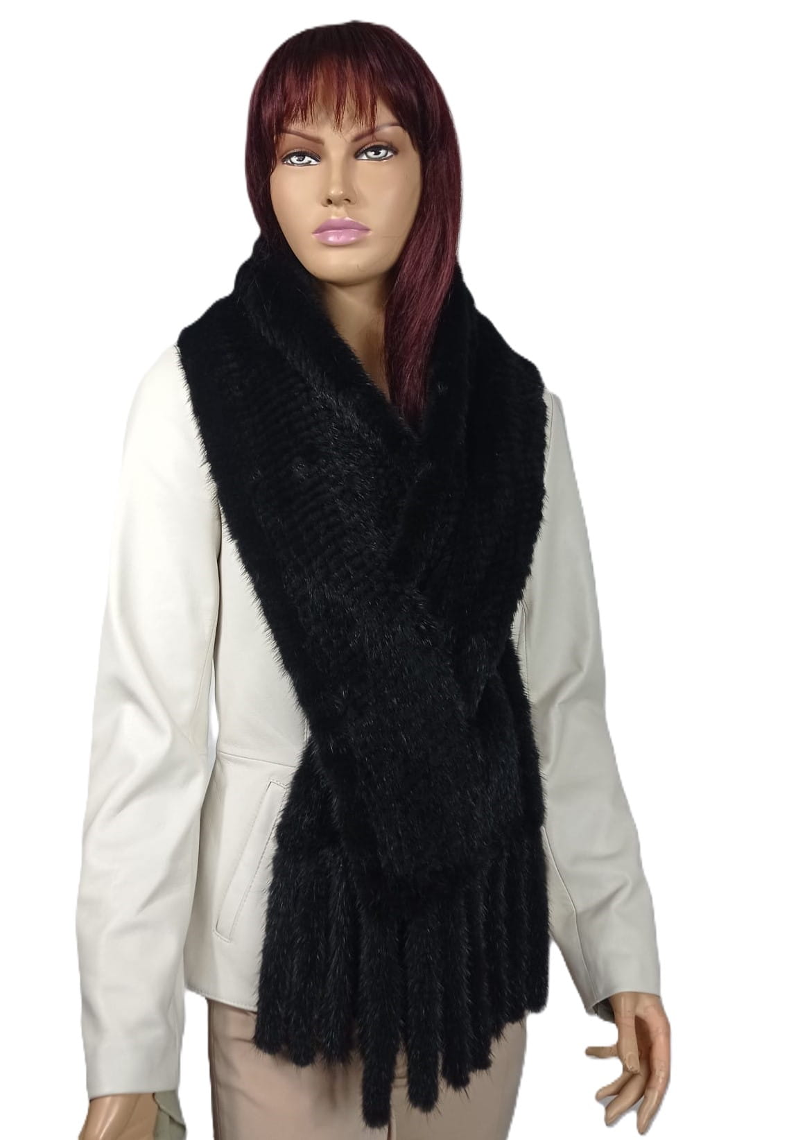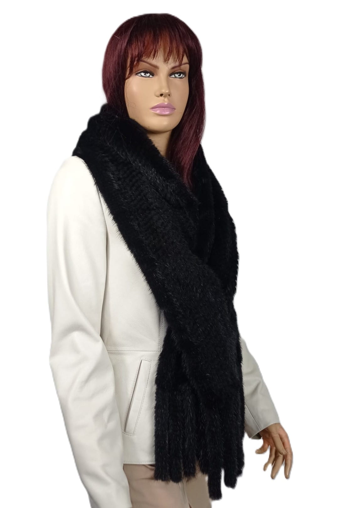 Elegancki szal wykonany z naturalnego, plecionego futra norki w klasycznym czarnym kolorze.