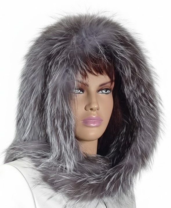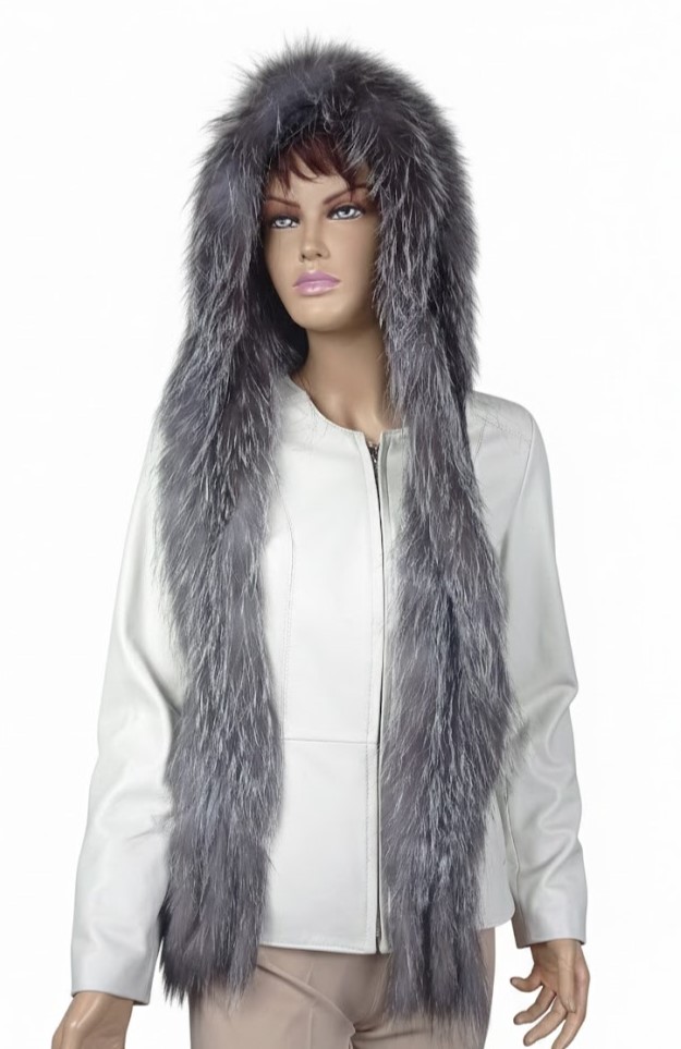 Wyjątkowy szalokaptur wykonany z naturalnego futra lisa w odcieniu grafitu z delikatnie przebijającymi się pasmami jasnej szarości.