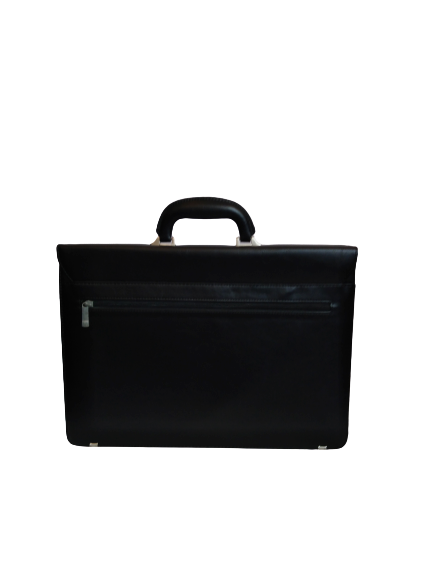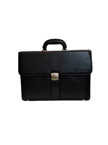 Wygodna i funkcjonalna teczka z imitacji skóry w kolorze czarnym.