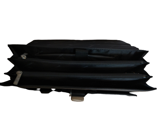 Teczka posiada cztery przegrody w tym jedna zapinana za zamek błyskawiczny oraz wie mniejsze kieszenie umiejscowione na zewnątrz.