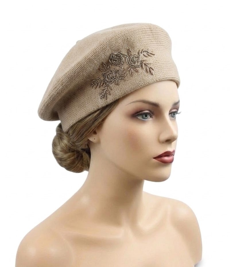 Beret wełniany z naszywką i koralikami to stylowy i oryginalny dodatek na chłodniejsze dni.
